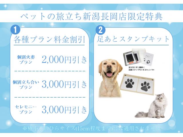 [新潟長岡店舗限定キャンペーン] ❶ ・個別火葬プラン2,000円引き ・個別立ち合いプラン3,000円引き ・セレモニープラン3,000円引き ❷ 足あとスタンプキットプレゼント ※極小手のひらサイズ(15cm程度まで)には適用されません。 ※お引き取りプランご利用の場合は対象外となります。(極小手のひらサイズ7,700円のプランは特典対象外となります) ※「新潟長岡店限定特典」の利用をご希望の方は、電話受付者へ「新潟長岡店舗限定特典」見たと必ずお伝えください。 現地にてお申し出をされた場合は特典を受けれない場合がありますのでご注意ください。 ※WEB予約システムからの特典申込はできませんのでご注意ください。 ※特典は予告なしに変更または終了する場合がございます。