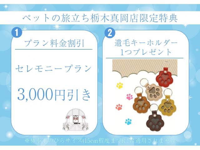 [栃木真岡店 限定キャンペーン] ❶ セレモニープラン3,000円引き ❷ 遺毛キーホルダーをお一つプレゼント ※「栃木真岡店限定特典」の利用をご希望の方は、電話受付者へ「栃木真岡店舗限定特典」見たと必ずお伝えください。 現地にてお申し出をされた場合は特典を受けれない場合がありますのでご注意ください。 ※WEB予約システムからの特典申込はできませんのでご注意ください。 ※特典は予告なしに変更または終了する場合がございます。